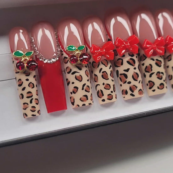 Enjoy this nail set with high gloss and color contrast, cheetah print with bright red bows. This set will catch the attention of anyone around you. This nail set is based off of a custom order. The nails are made to order upon purchase!